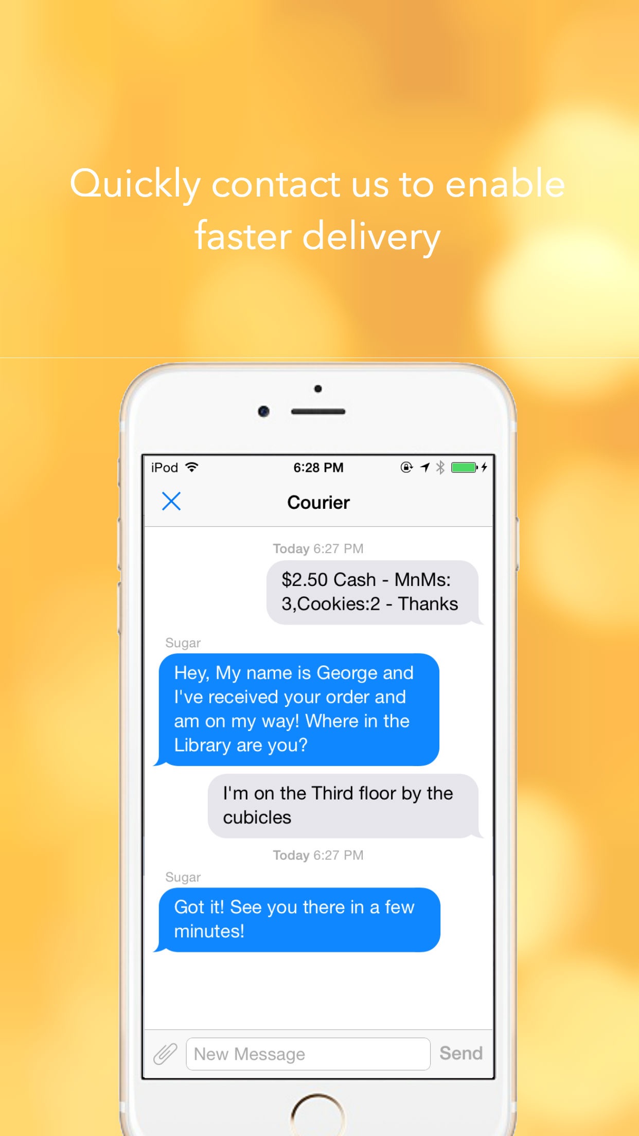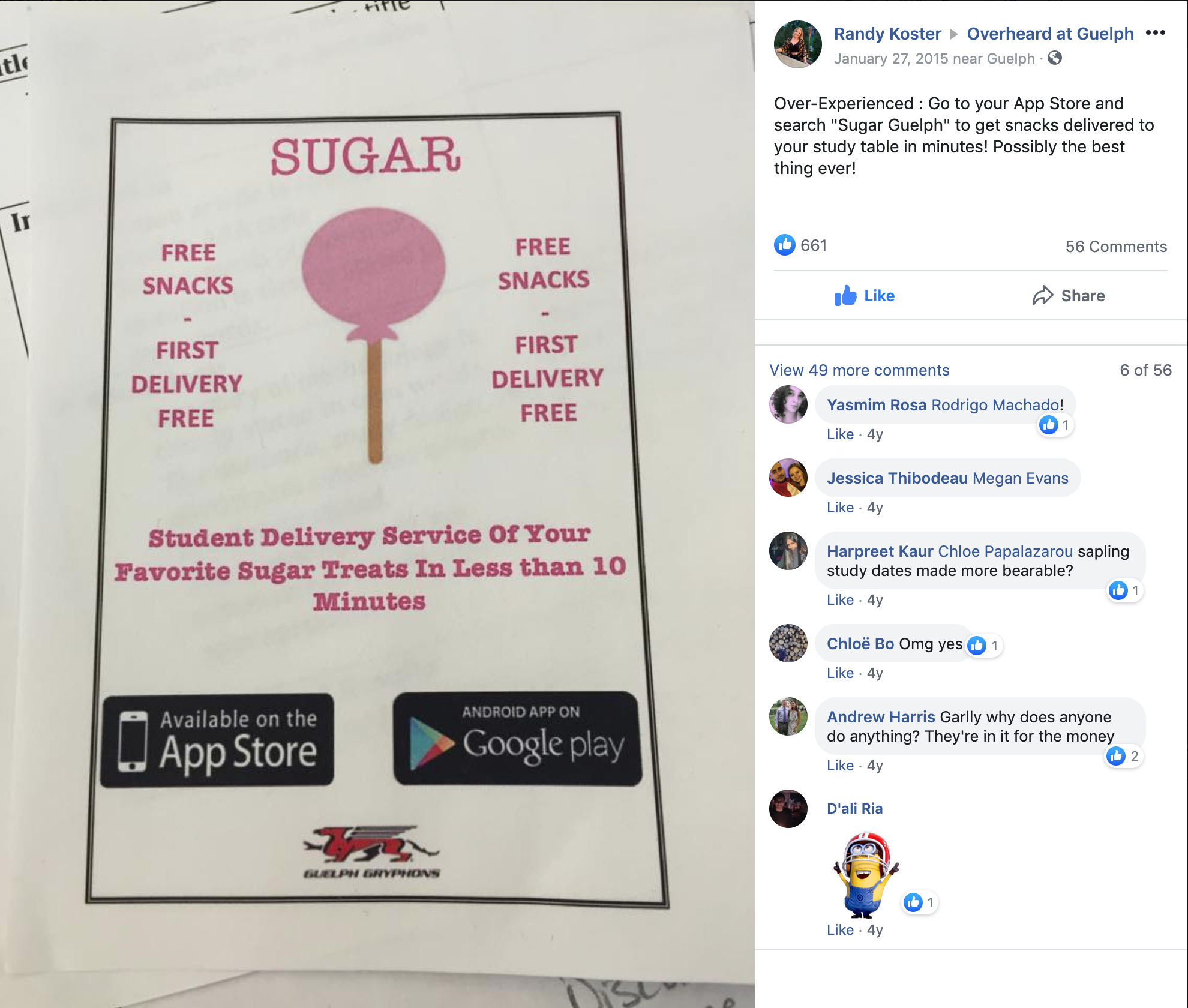 To be honest, the genesis of the sugar app came about during a bout of intense studying in a crowded library. Once you get into a work-zone, where you seem to absorb 10 times more information and appear to be 10 times more productive, you don’t ever want to leave it. Not to go to the washroom, not to go get a snack, not to mindlessly waste time on social media. What happens when you do want the kick of caffeine to hit overdrive, or a little sugar therapy to extend your study session? You could pack up your stuff, head to the nearest snack shop, and buy a severely overpriced bag of chips from the university. Okay, now you’re satiated and ready to head back to your work-zone and pick up where you left off - except the library is still over-crowded and you can’t find a place to work. Anyways, you get the idea - and thus this simple idea becomes useful.